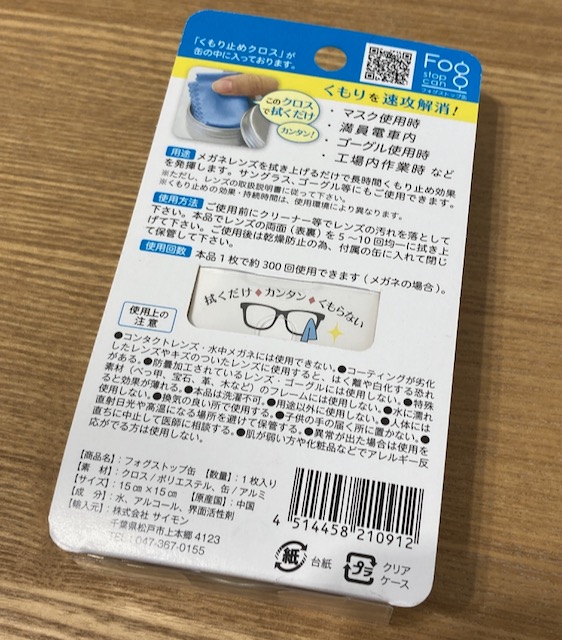 レビューの評価も高かったSiMON(サイモン)のメガネクロス「フォグストップ缶」を購入しました。