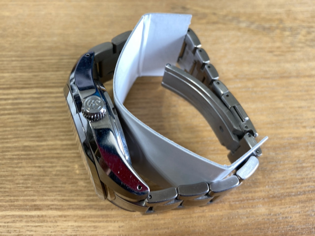 処置内容 : お預かりの時計は、オーバーホール(脱磁含め)を行い、ケースとバンドにライトポリッシュを施し、パッキンの交換を実施しました。また、りゅうずの交換および巻真パイプの交換を行いました。この後、所定の検査で問題が無いことを確認いたしました。